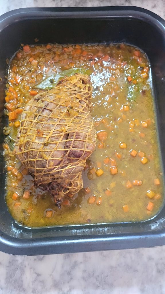 Für dieses Rezept habe ich ein Kalbsstück gewählt, aber man kann es auch durch einen günstigeren und ebenso schmackhaften und zarten Schweinebraten ersetzen.