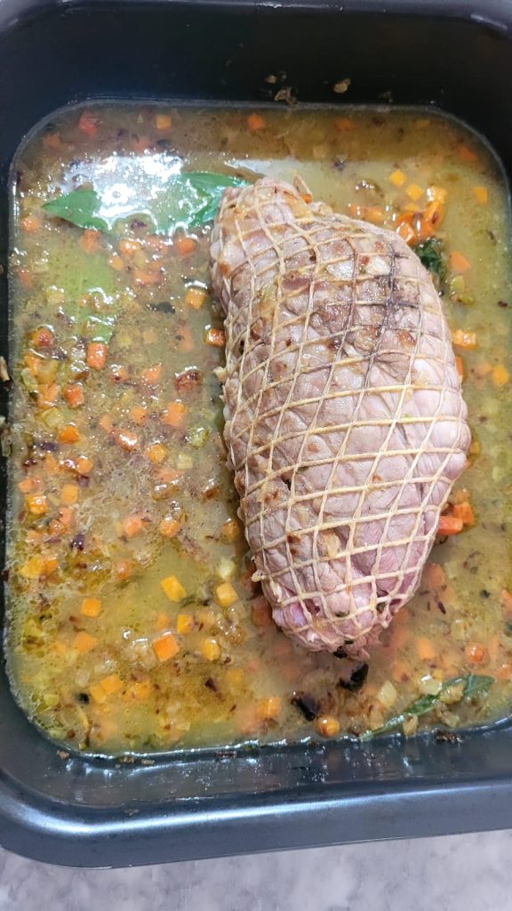 In der Pfanne: Sobald mit dem Wein abgelöscht wurde, füge den gefilterten Orangensaft hinzu, decke ab und gare für etwa 1 Stunde (immer abhängig vom Gewicht des Fleischstücks), befeuchte und wende es während des Garens und halte die Flamme niedrig.