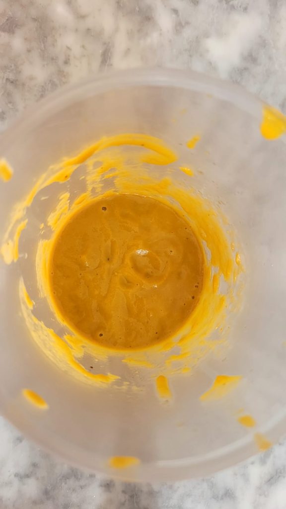 In der Zwischenzeit bereite die Orangensauce vor: Dazu gib den Bratenfond, entferne den Salbei und den Lorbeer, in ein Gefäß und püriere ihn mit dem Stabmixer.