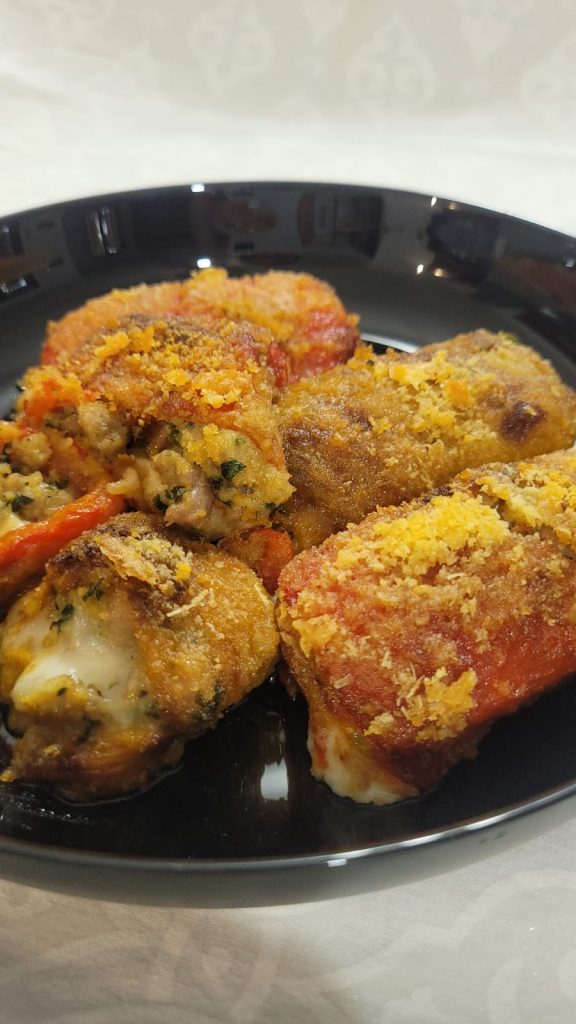 Paprika sind eine Zutat mit tausend Zubereitungsmöglichkeiten. Sie sind ein Gemüse, das Fleisch- oder Pastagerichte bereichern kann und dabei den unverwechselbaren Geschmack verleiht, der sie auszeichnet. Für das Rezept der Paprikaröllchen mit Wurst habe ich die Heißluftfritteuse verwendet, sowohl um sie zu rösten als auch um sie mit ihrer Füllung zu garen, und das alles in kurzer Zeit. Sie können die Röllchen in mehreren Etappen zubereiten, wie ich es getan habe, indem Sie die Paprika am Vortag rösten, diese dann schälen und die Samen und inneren Fäden entfernen. So können sie im Kühlschrank auf einem mit Folie bedeckten Teller oder in einem luftdichten Behälter aufbewahrt werden, sodass Sie sich am nächsten Tag der Füllung widmen und sie zubereiten und garen können. Wenn Sie kein Fleisch verwenden möchten, können Sie die Röllchen in einer vegetarischen Version mit einer Mischung aus Semmelbröseln, Käse und Gewürzen Ihrer Wahl zubereiten. Jetzt lasst uns diese köstlichen Paprikaröllchen mit Wurst zubereiten.