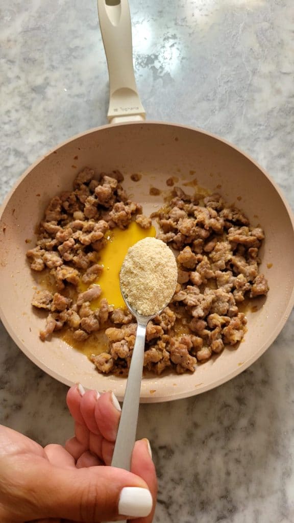 Den geriebenen Pecorino Romano, Pfeffer, Petersilie und eine Prise Salz hinzufügen, aber nicht zu viel, da die Wurst schon salzig ist