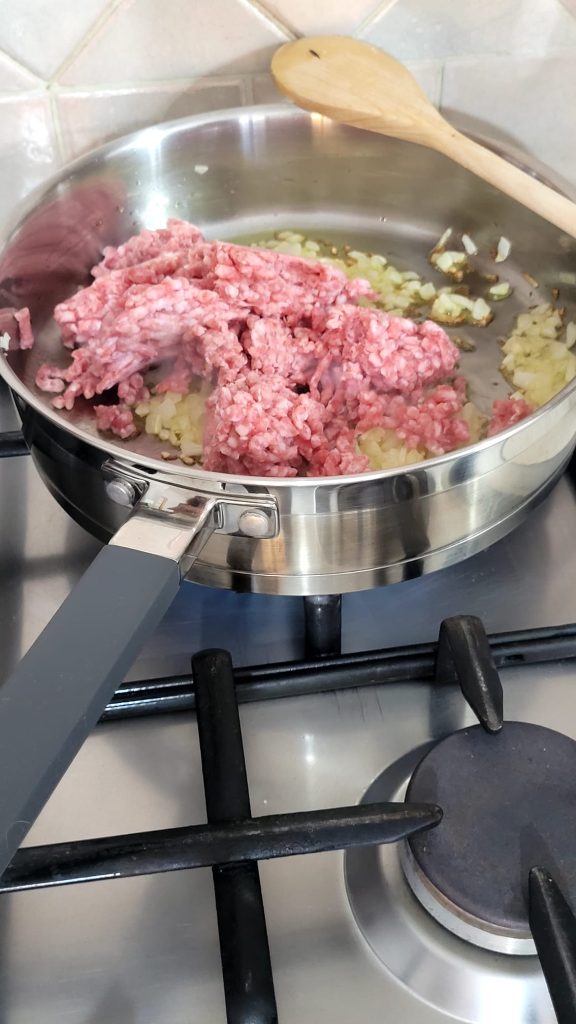 Wenn die Zwiebel gebraten ist, fügen Sie das Hackfleisch hinzu und lassen Sie es bei mittlerer Hitze bräunen, während Sie rühren