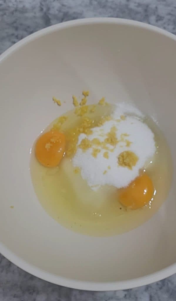 • Schlagen Sie in einer Schüssel die Eier mit dem Zucker, dem Vanillin und der geriebenen Zitronenschale etwa 4/5 Minuten, bis die Mischung hell, luftig und schaumig ist