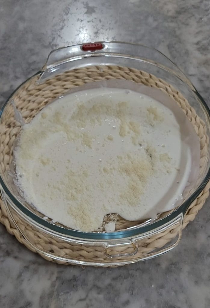Den Boden der Backform mit der restlichen Sahne bedecken und den geriebenen Grana hinzufügen