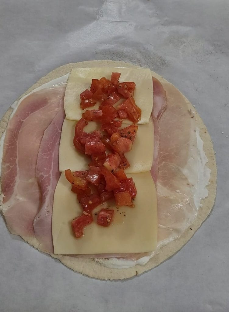 Der Reihe nach den gekochten Schinken, den geschnittenen Käse und die in einer Schüssel mit Öl, Salz und Oregano gewürzten Tomaten in die Mitte geben.
