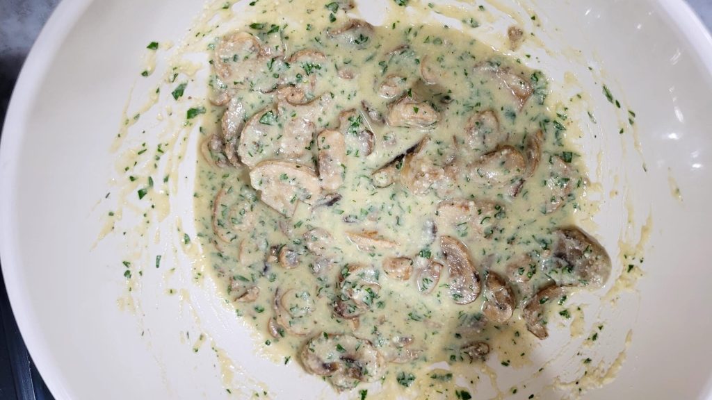 Geben Sie nun die Pilze, die Petersilie, Salz und Pfeffer zur Mischung.