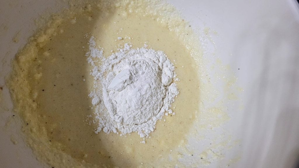 Fügen Sie 3 Esslöffel Mehl hinzu und mischen Sie erneut.