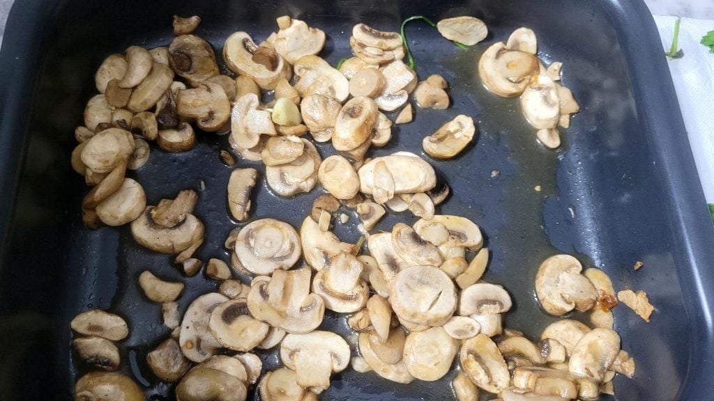 Spülen Sie die Pilze unter fließendem Wasser und tupfen Sie sie mit Küchenpapier trocken. Geben Sie sie in eine Backform mit einer Knoblauchzehe und würzen Sie mit Olivenöl, Salz, Pfeffer, zerkleinertem Chili und einigen Petersilienzweigen.