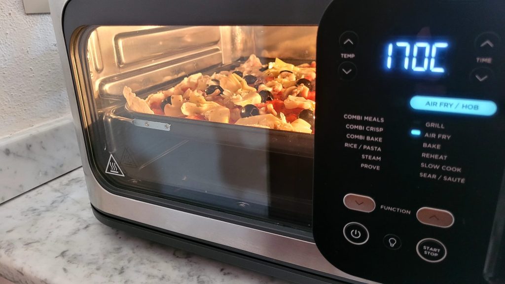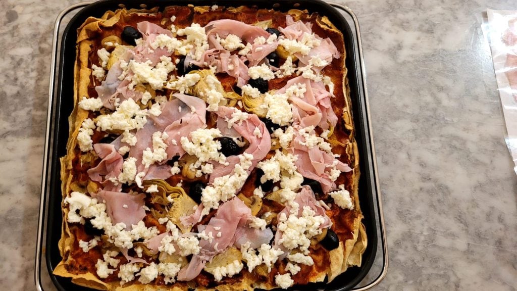 Und hier bin ich mit einem weiteren Rezept, in dem Pane Carasau die Hauptrolle spielt: die Pizza Capricciosa mit Pane Carasau, gebacken mit meiner Küchenhelferin, der Heißluftfritteuse.