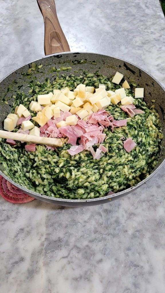 • Füge den Scamorza und den Schinken zum Risotto hinzu