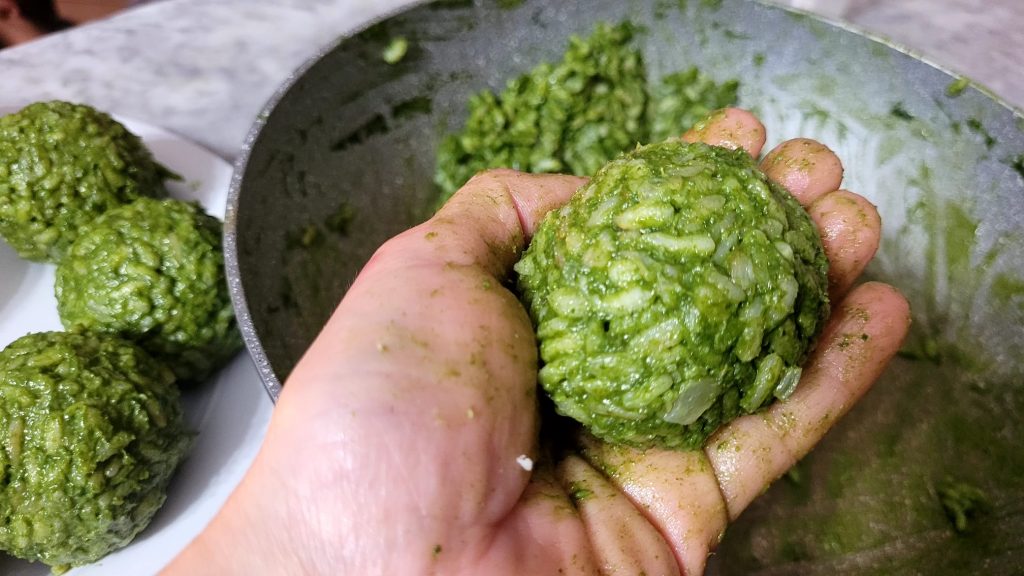 Für das Rezept der Reisbällchen mit Spinat habe ich den Spinat in der Pfanne mit Olivenöl und Knoblauch gegart, einen klassischen Risotto zubereitet, der mit Butter und Grana Padano abgerundet wurde, und nach dem Abkühlen ein Ei hinzugefügt. Um die Bällchen zart und lecker zu machen, habe ich in der Mitte den ‚dolce sardo‘ eingefügt, einen frischen Weichkäse, den Sie problemlos auch durch Mozzarella oder Ihren bevorzugten Käse ersetzen können. Wollen wir sie zubereiten?