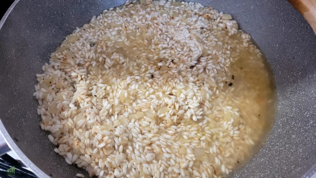Mit Weißwein ablöschen und vollständig verdampfen lassen. Die Reiskörner weiter kochen und nach und nach die heiße Brühe hinzufügen, häufig umrühren