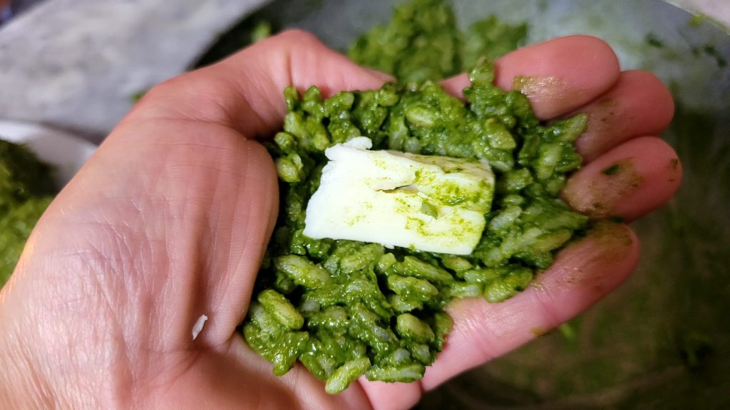 Den Käse in Stücke schneiden, etwas Reis nehmen und ein Stück Käse in die Mitte legen