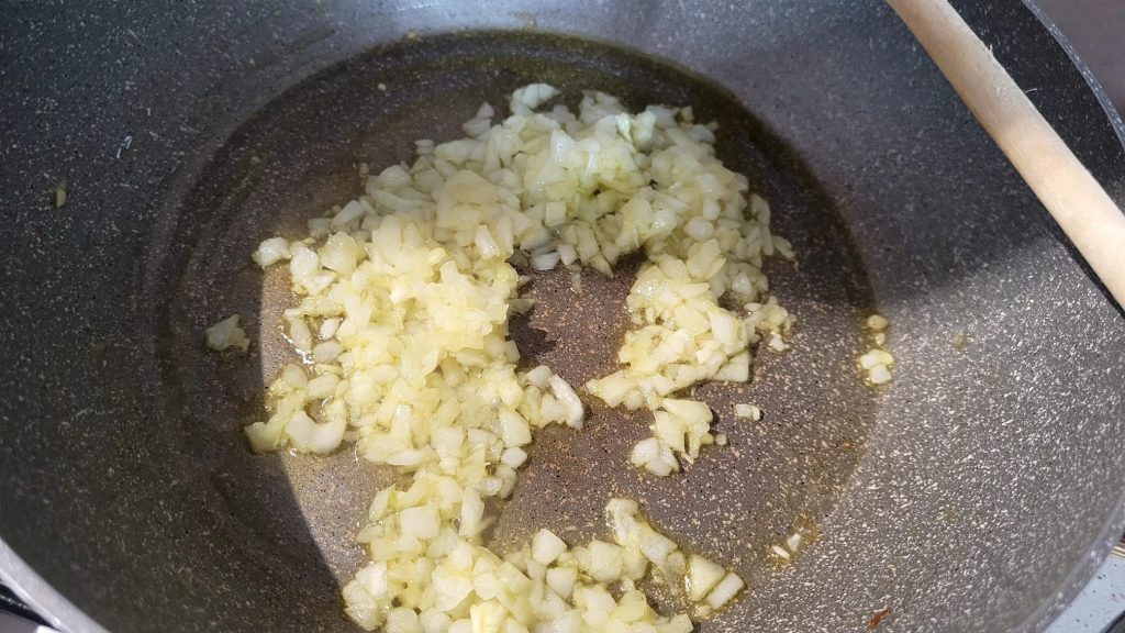 Nach dem Schälen der Zwiebel diese in einer Pfanne mit etwas nativem Olivenöl oder alternativ mit einem Stück Butter anschwitzen