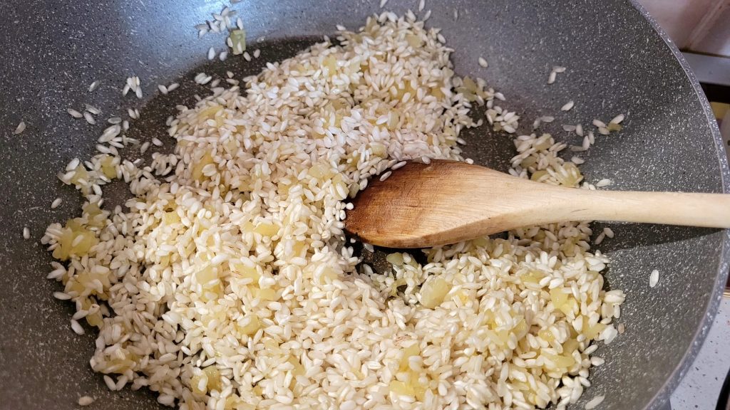Sobald die Zwiebel weich ist, den Reis hinzufügen und unter Rühren mit einem Löffel anrösten