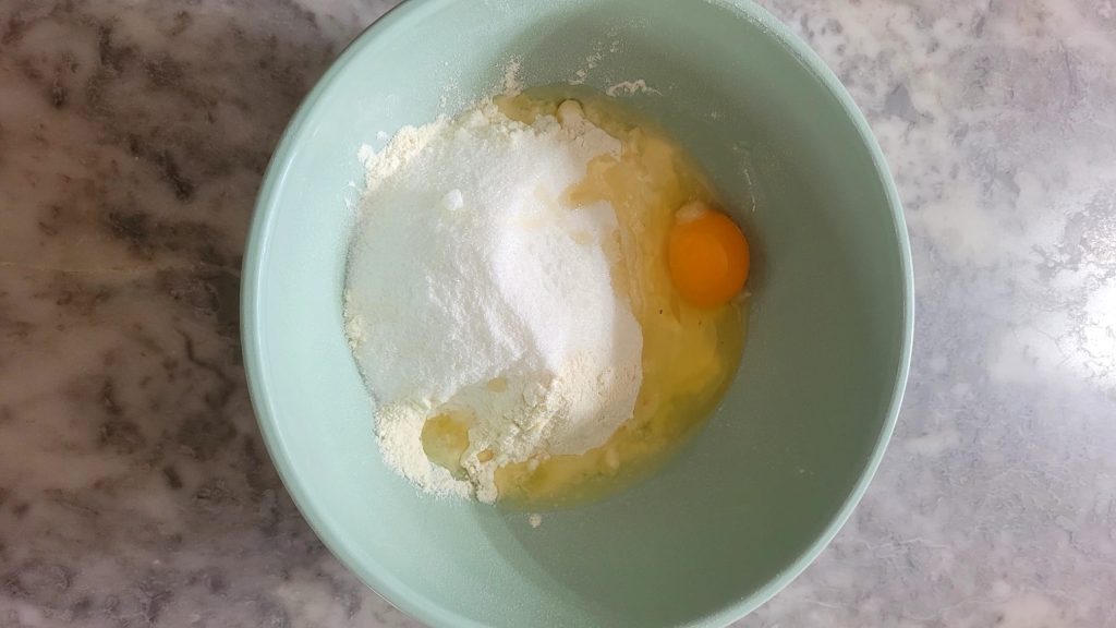 In einer Schüssel Mehl, Eier, Zucker und eine großzügige Prise Salz vermengen