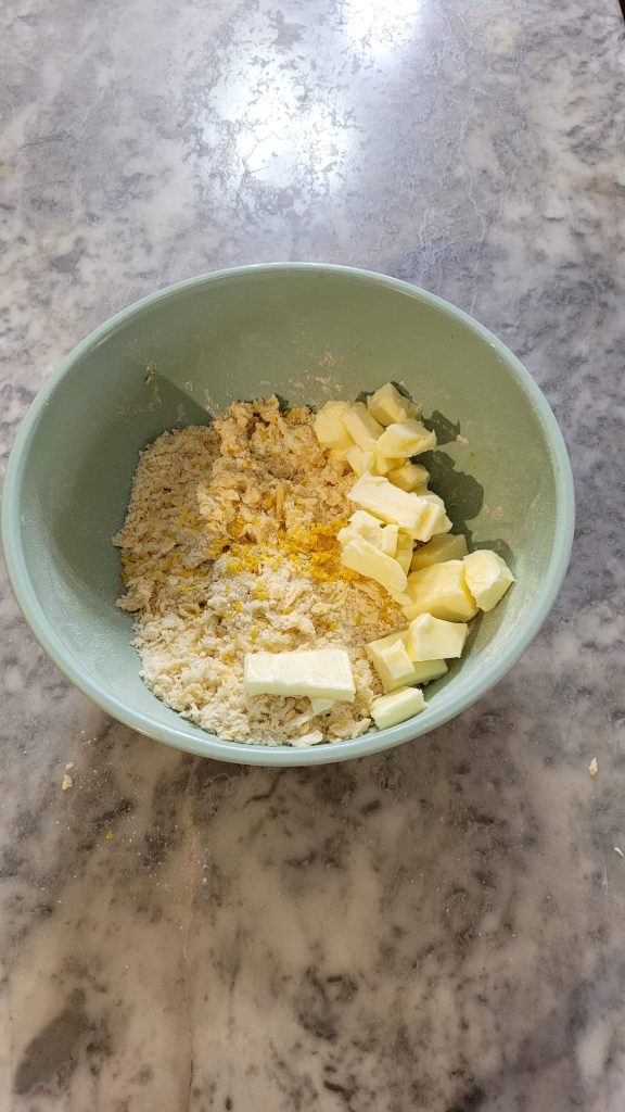 Mit einer Gabel die Zutaten zu einer sandigen Konsistenz verarbeiten. Die abgeriebene Schale einer halben Zitrone und die weiche, in Stücke geschnittene Butter hinzufügen. Schnell mit den Händen zu einem glatten, kompakten Teig verkneten