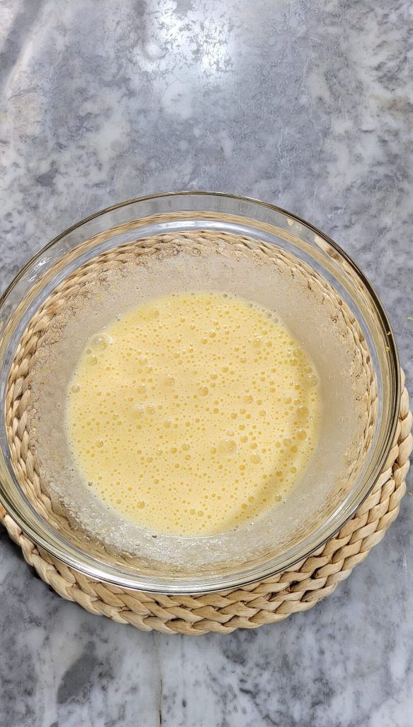 Eier, Zucker und die abgeriebene Zitronenschale mit einem Schneebesen 5 Minuten schlagen