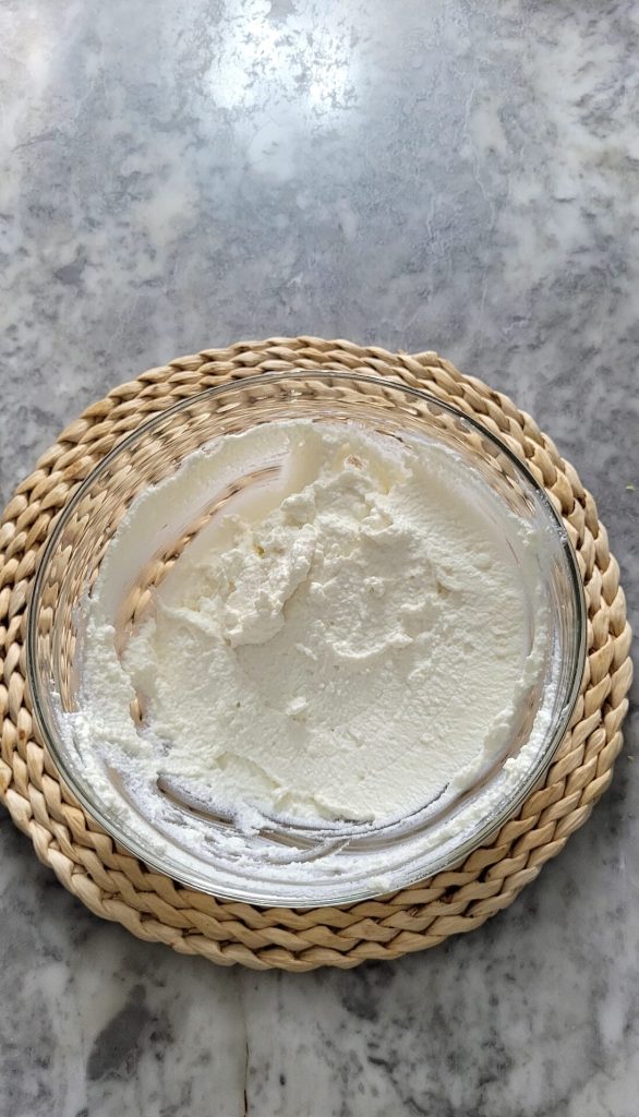 Die Eimischung zur Schüssel mit Ricotta und Joghurt geben und vorsichtig mit einem Spatel unterheben, langsam rühren
