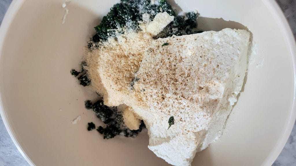 Fügen Sie Ricotta, geriebenen Grana, Pfeffer, Muskatnuss hinzu und würzen Sie mit Salz. Mischen Sie alle Zutaten gut