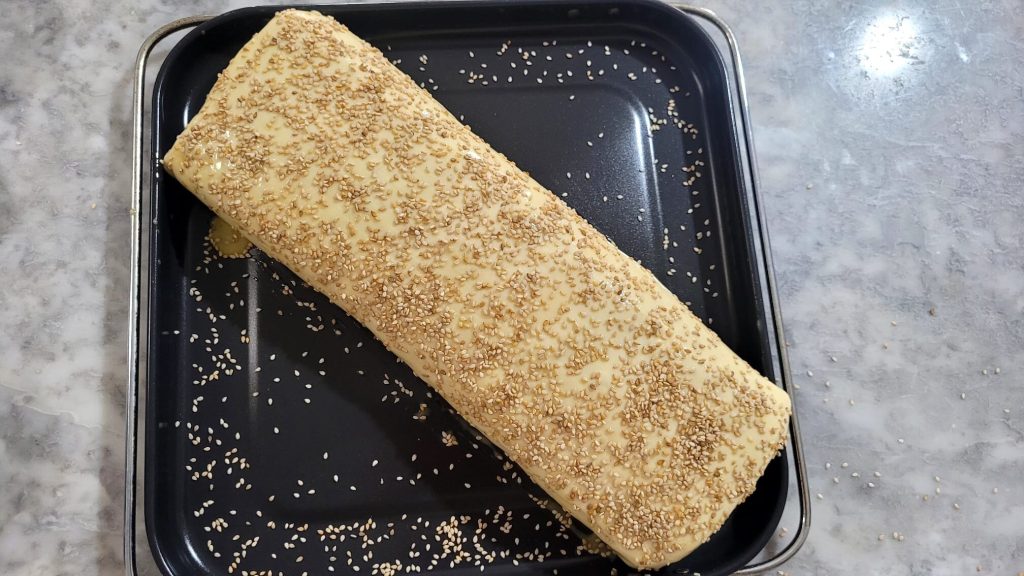 Drehen Sie es mit der Verschlussseite nach unten. Bestreichen Sie es mit dem geschlagenen Ei und bestreuen Sie die Oberfläche mit Sesamkörnern. Legen Sie es auf ein Tablett oder direkt auf den Rost der Heißluftfritteuse. Backen Sie es bei 170° für 30 Minuten