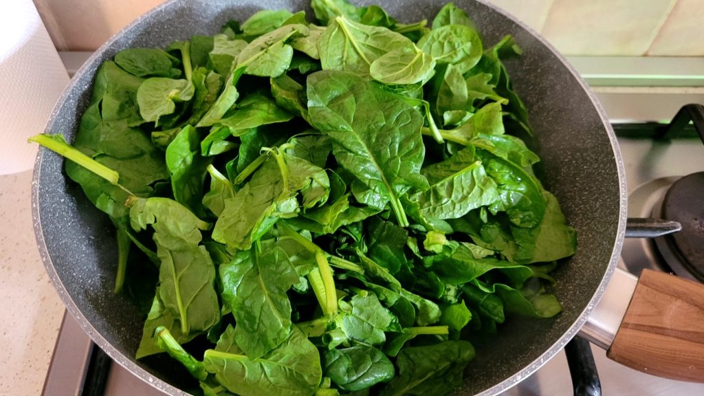 Geben Sie den zuvor gewaschenen Spinat hinzu, salzen Sie, decken Sie mit einem Deckel ab und lassen Sie ihn kochen, es dauert nur wenige Minuten