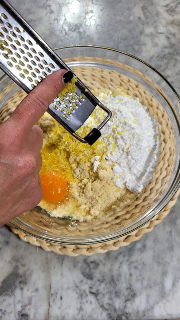 • Während der Teig ruht, bereiten Sie die Füllung vor. Geben Sie in eine Schüssel den Ricotta, das Ei, den Zucker, die abgeriebene Zitronen- und Orangenschale. Ich habe ein paar Tropfen Zitronen- und Orangenaroma für einen intensiveren Duft hinzugefügt