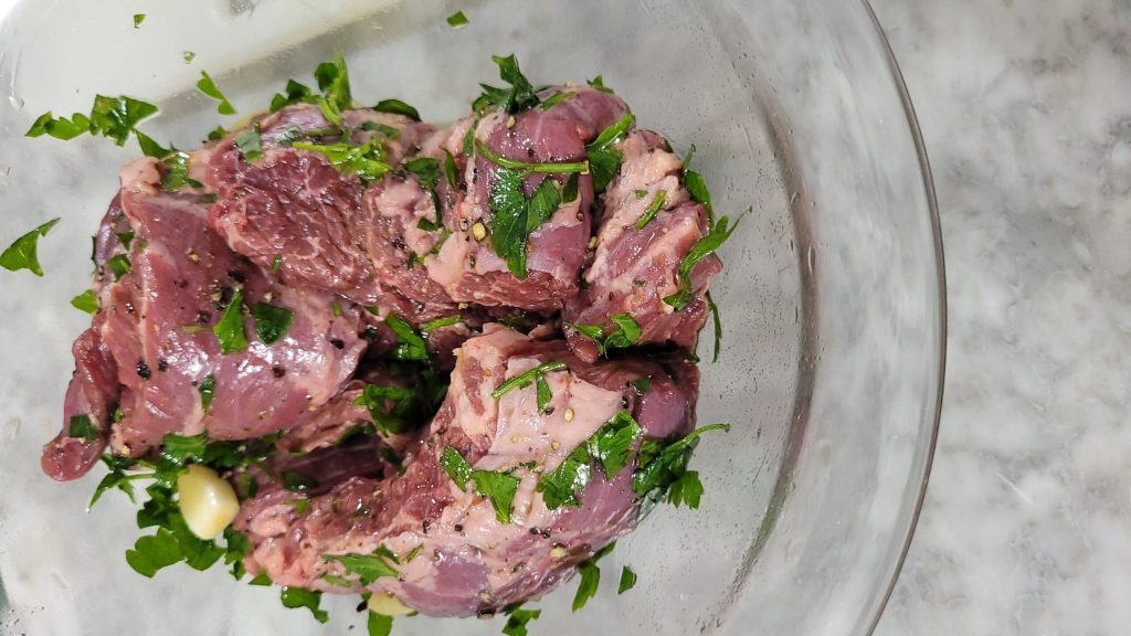 Legen Sie das Fleisch in eine Schüssel zusammen mit dem Olivenöl, Salz, Pfeffer, grob gehackter Petersilie und ein paar Knoblauchzehen. Decken Sie die Schüssel mit Frischhaltefolie ab und lassen Sie sie 4 Stunden im Kühlschrank ruhen.