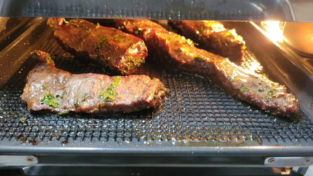 Setzen Sie das Backblech auf die oberste Ebene Ihrer Heißluftfritteuse, wenn Sie einen Ofen haben, oder direkt auf den Rost, wenn Sie eine Schubladenfritteuse haben, und garen Sie bei 240° für 10 Minuten. Ich habe das Fleisch in den letzten 3 Minuten gewendet, um eine gleichmäßige Garung auf beiden Seiten zu erzielen