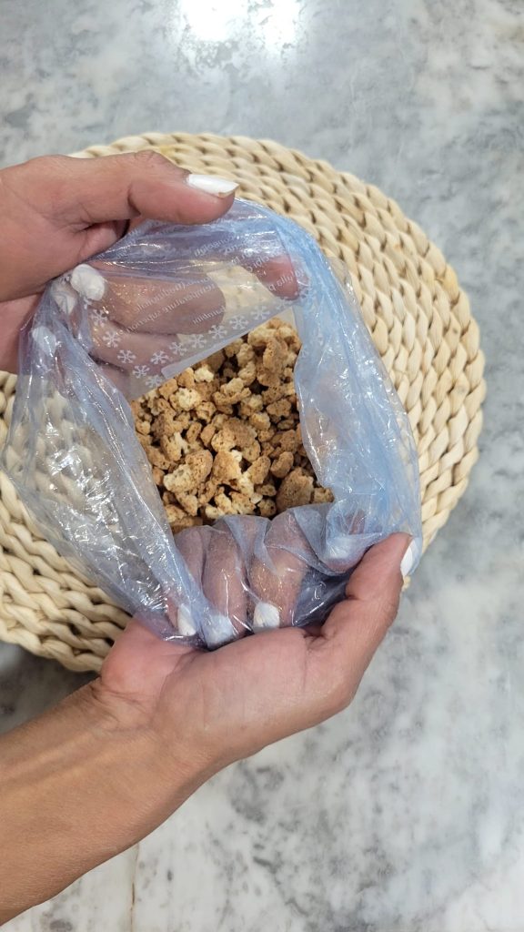 Legen Sie den Beutel auf eine Fläche und drücken Sie ihn mit den Händen, um sie grob zu zerbröseln
