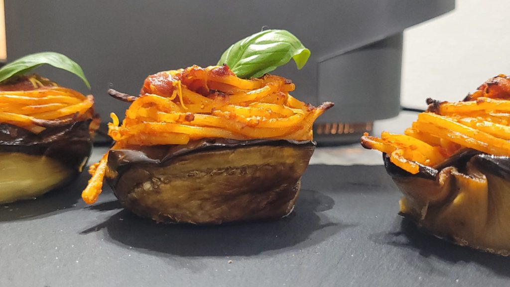 Ich liebe Einzelportionen und auch Spaghetti alla Norma, ein typisches sizilianisches Gericht mit gebratenen Auberginen und gesalzenem Ricotta. Der Unterschied zur Originalversion liegt im doppelten Garvorgang, der nicht vorgesehen ist, da die Spaghetti, sobald sie fertig sind, serviert werden und sowohl die Auberginen als auch die Timballen in der Heißluftfritteuse zubereitet werden. Sicherlich ein leichteres Gericht, aber nicht weniger schmackhaft als die klassische Version. Sie können es im Voraus zubereiten und die Garzeit in der Fritteuse oder im Ofen kurz vor dem Servieren fortsetzen.