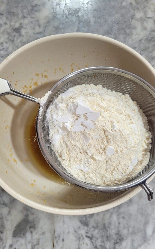 • Integrieren Sie das gesiebte Mehl, die Stärke und das Backpulver.