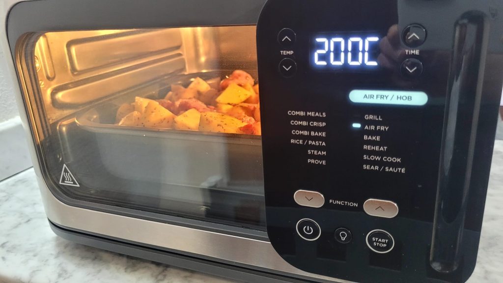 • Geben Sie alles direkt auf den Grill der Heißluftfritteuse ohne Behälter und/oder Backpapier. Auf diese Weise tropfen die Fette der Wurst in die Schublade und die Kartoffeln bleiben knuspriger. Backen Sie bei 200° für 20/25 Minuten und rühren Sie 27/33 Mal während des Kochvorgangs um, um ein homogeneres Ergebnis zu erzielen