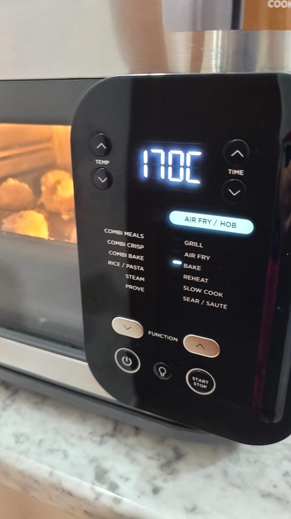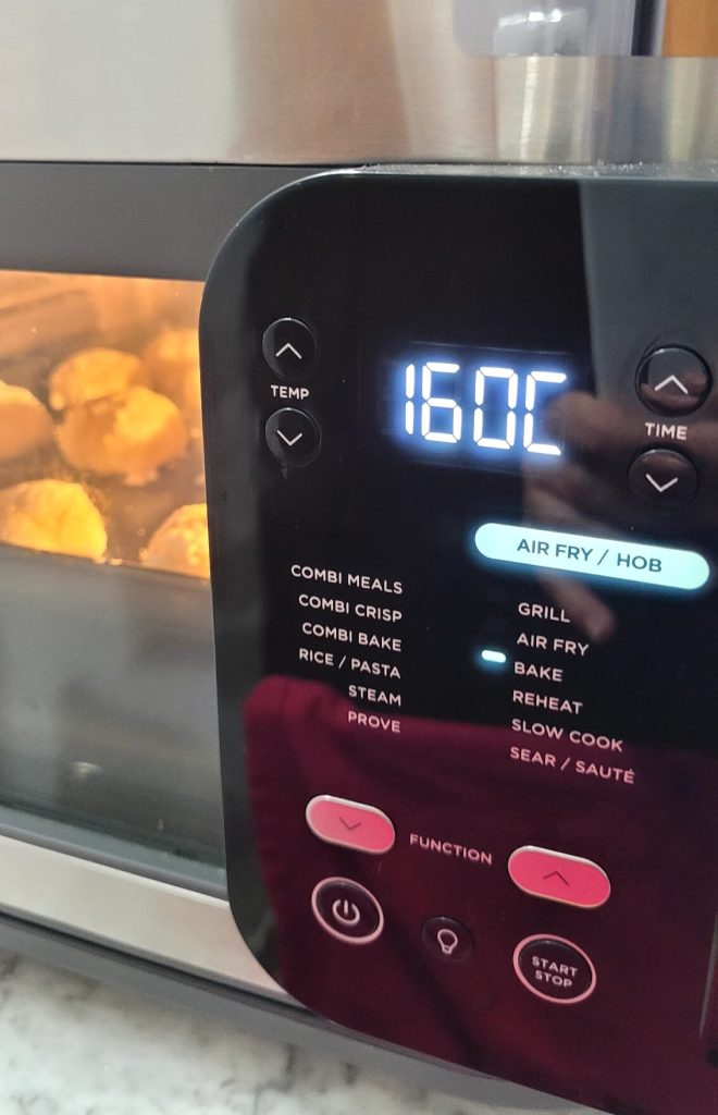 Legen Sie die Kugeln mit ausreichend Abstand auf das Backblech oder den Rost. Heizen Sie die Heißluftfritteuse im Bake- oder Air-Fry-Programm auf 170°C für ein paar Minuten vor