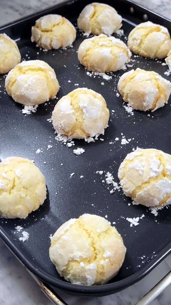 Die Zitronenkekse zuzubereiten ist wirklich einfach, es werden keine Formen oder andere Arten von Utensilien benötigt: Eine Schüssel und ein Schneebesen genügen. Formen Sie mit den Händen kleine Kugeln, rollen Sie sie zuerst im Kristallzucker, dann im Puderzucker und legen Sie sie in eine Backform oder auf den Rost der Heißluftfritteuse.