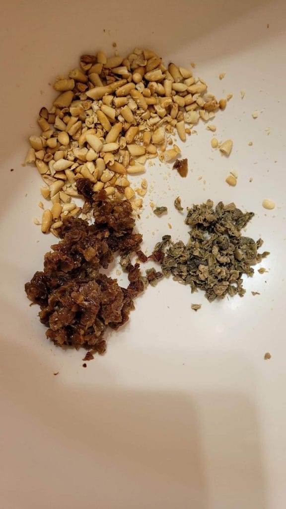 Auf einem Schneidebrett habe ich die gerösteten Pinienkerne grob gehackt. Ich habe die Kapern, die ich zuvor entsalzt hatte, und die Rosinen, die ich in einem Glas mit warmem Wasser rehydriert hatte, gehackt und dann ebenfalls mit einem Messer zerkleinert. Ich habe die Zucchini in Stücke geschnitten und alles zusammen in eine Schüssel gegeben, mit einem guten Schuss nativem Olivenöl.