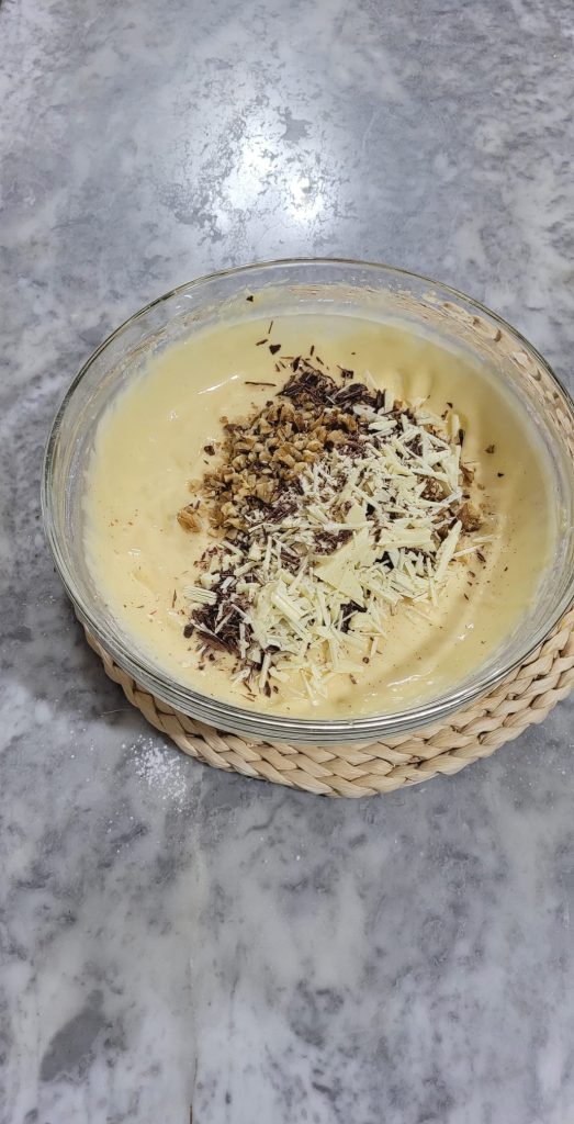 Fügen Sie die Walnüsse und die Schokolade zur Mischung hinzu.