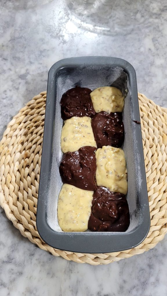 Fetten und mehlen Sie die Form ein und geben Sie mit einem Löffel den Teig abwechselnd hell und schokoladig hinein, um ein Schachbrettmuster zu bilden.