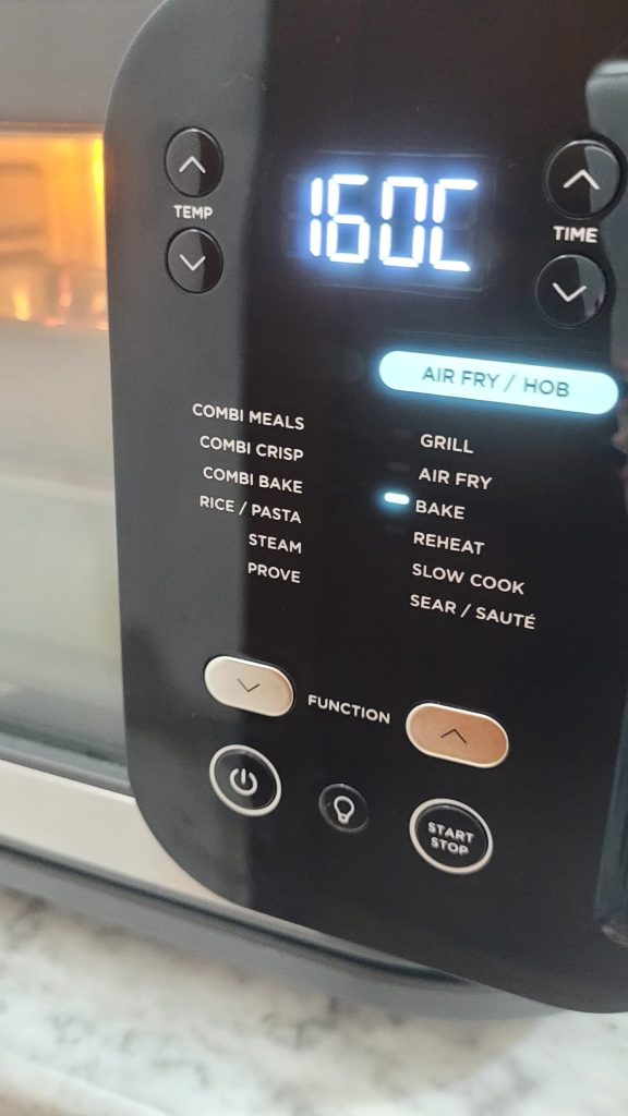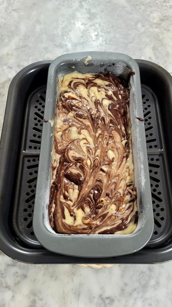 – Heißluftfritteuse: Die Fritteuse 2/3 Minuten vorheizen und die Form auf das Gitter stellen. Mit dem Programm bake oder air fry 40 Minuten backen. Machen Sie den Zahnstocher-Test an mehreren Stellen, aber nicht vor den ersten 30 Minuten. Wenn er trocken ist, ist er durch, sonst weiterbacken.