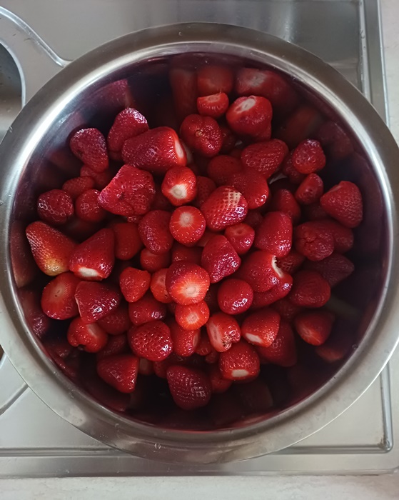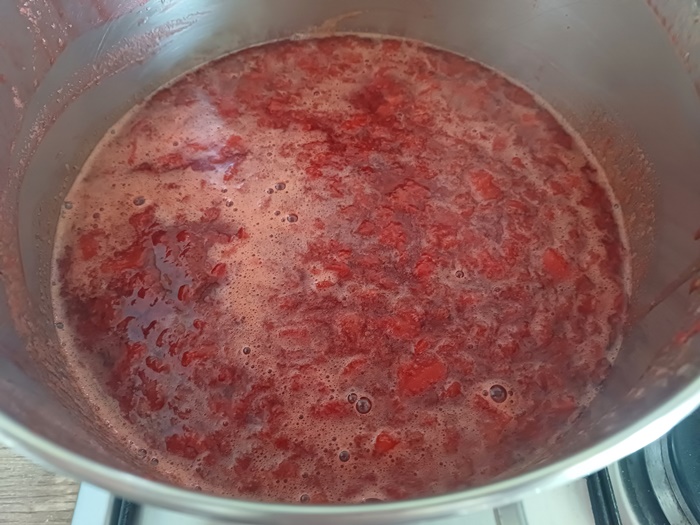 Gebt die gewürfelten Erdbeeren in eine große Kasserolle, fügt den Essig hinzu (er wird nicht im Geschmack wahrgenommen, dient zur Vermeidung von Botulismus), den Zitronensaft und das Wasser, rührt um, deckt mit einem Deckel ab und bringt es zum Kochen.