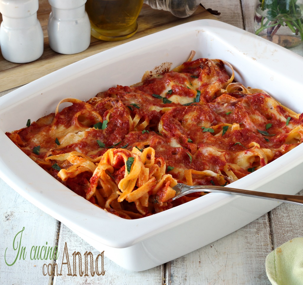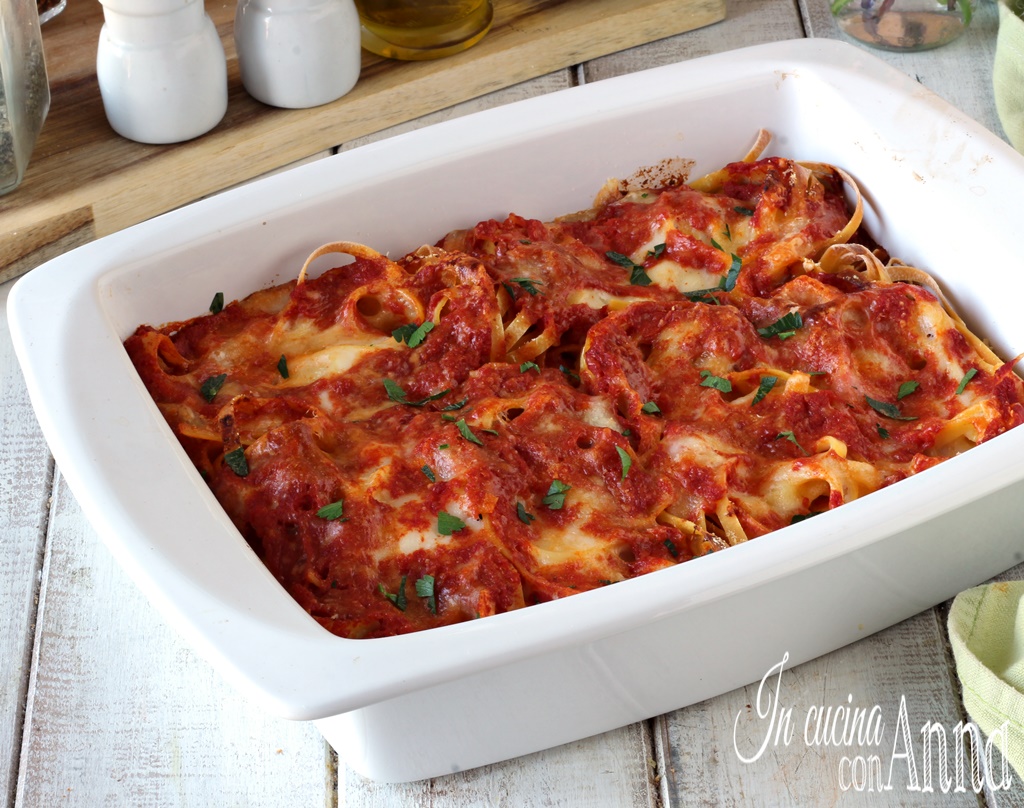 Backen Sie bei 180° für etwa 30 Minuten, die Tagliatelle sollten gekocht sein und oben sollte eine leichte Kruste sein.