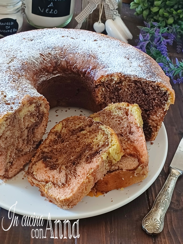 Lassen Sie den Kranzkuchen abkühlen, dann legen Sie ihn auf eine Platte und bestreuen Sie ihn nach Belieben mit Puderzucker.Der Marmorierte Kranzkuchen mit Englischer Suppe ist bereit zum Genießen, guten Kuchen!
