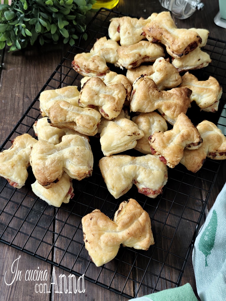 Die rustikalen Blätterteig-Schleifen sind hübsche Häppchen, leicht zuzubereiten, raffiniert und geschmackvoll. Perfekt für Aperitifs, als Vorspeise oder fürs Partybuffet – macht viele, sie sind bestimmt schnell weg.