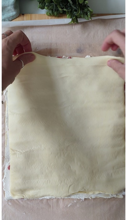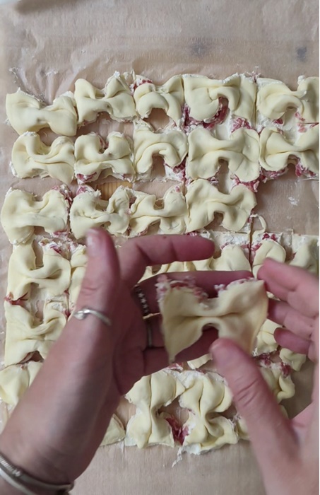 Die Zubereitung der rustikalen Blätterteig-Schleifen ist ganz einfach. Mit dem oben gezeigten Video ist es ein Kinderspiel; hier erkläre ich euch die Schritte anhand von Fotos.