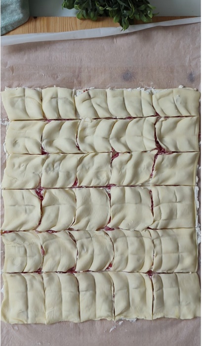 Schneidet mit einem scharfen Messer 6 senkrechte Streifen quer durch den Teig (auch die obere Teigschicht durchtrennen), sodass sich Streifen voneinander lösen.