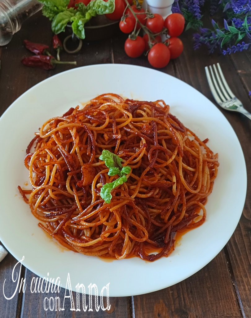 Das Hauptmerkmal ist das Garen in der Pfanne, wo die Spaghetti direkt mit der Sauce gekocht werden, indem man nach und nach gesalzenes kochendes Wasser hinzufügt. Dieses Gericht ist sehr einfach, schnell und köstlich und perfekt für jede Gelegenheit und in jeder Jahreszeit. Probieren Sie sie aus und Sie werden sehen, wie lecker sie sind 🙂