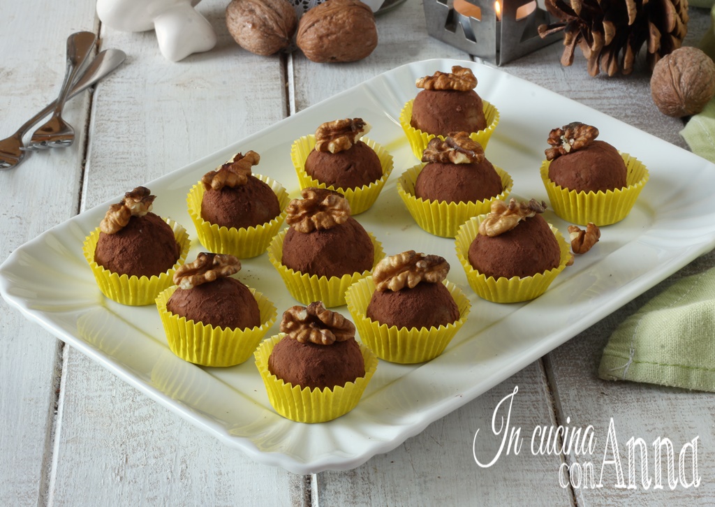 Legen Sie sie mindestens 1 Stunde vor dem Servieren in den Kühlschrank.Die Trüffel mit Walnüssen und Schokolade sind bereit, genossen zu werden.