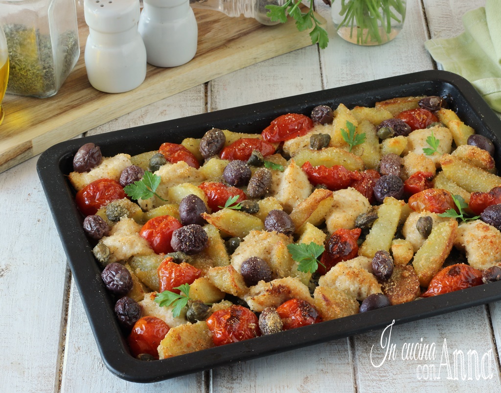 Das überbackene Hähnchen auf mediterrane Art ist ein sehr einfach zuzubereitendes Hauptgericht, lecker und würzig. Ein komplettes Hauptgericht mit Beilage, das mit wenig Aufwand alle glücklich macht. Es ist in der Tat sehr einfach zuzubereiten, man muss nur alle Zutaten vorbereiten, diese spezielle Panade hinzufügen, alles in den Ofen und fertig ist es, probieren Sie es, es ist ein wirklich großartiges Gericht, das Sie beim ersten Bissen überzeugen wird.