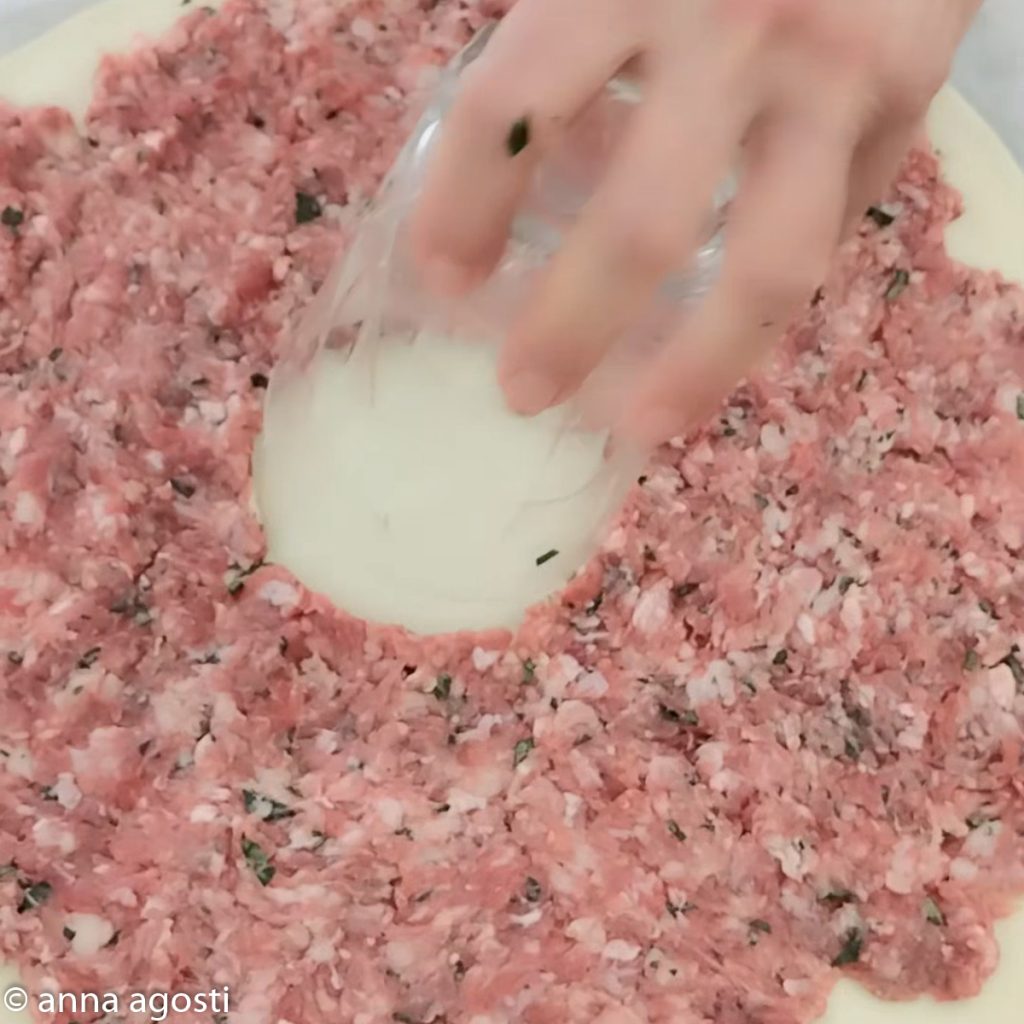 • In der Mitte platzieren Sie ein Glas als Hilfsmittel und verteilen das Fleisch in Häufchen darauf.