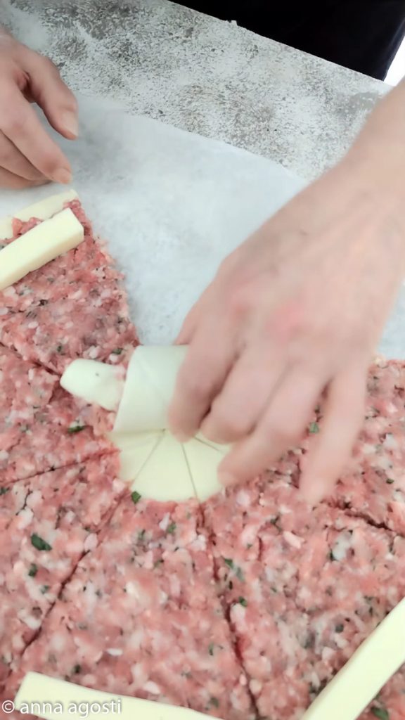 3- Fügen Sie, bevor Sie das Fleisch verteilen, eine Scheibe Speck oder gekochten Schinken hinzu.